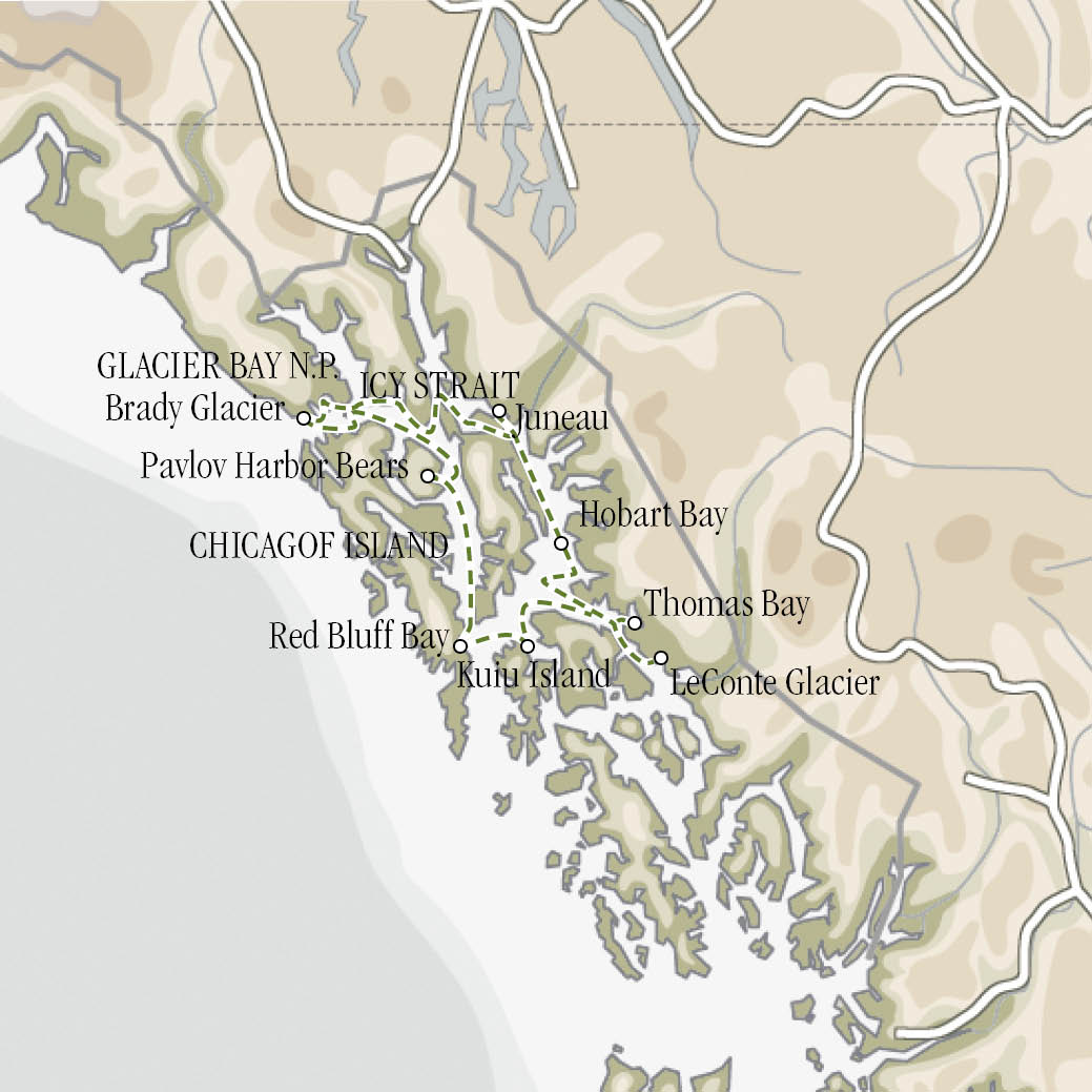 Der Anker sinkt in das milchblau schimmernde Wasser von Thomas Bay, während die Sommersonne den Nebel durchbricht und der Dunst sich hebt. Dies ist ein beliebter Ort für die Crew, einer der wenigen zugänglichen Wanderwege im Südosten Alaskas. Ein unvergessliches Erlebnis, das für jedes Fitnesslevel geeignet ist. Nach der Erkundung des Waldes kehren Sie zum Schiff zurück, wo ein herzhaftes Mittagessen auf Sie wartet, während das Schiff sich zur anderen Seite von Thomas Bay verlegt, um neue Abenteuer zu erleben. Der Zugang zum Wasser ist hier einzigartig – ein Kajak-Ausflug zu einem Lachslauf oder eine Fahrt mit dem Boot auf Bärensuche runden Ihren Tag ab.