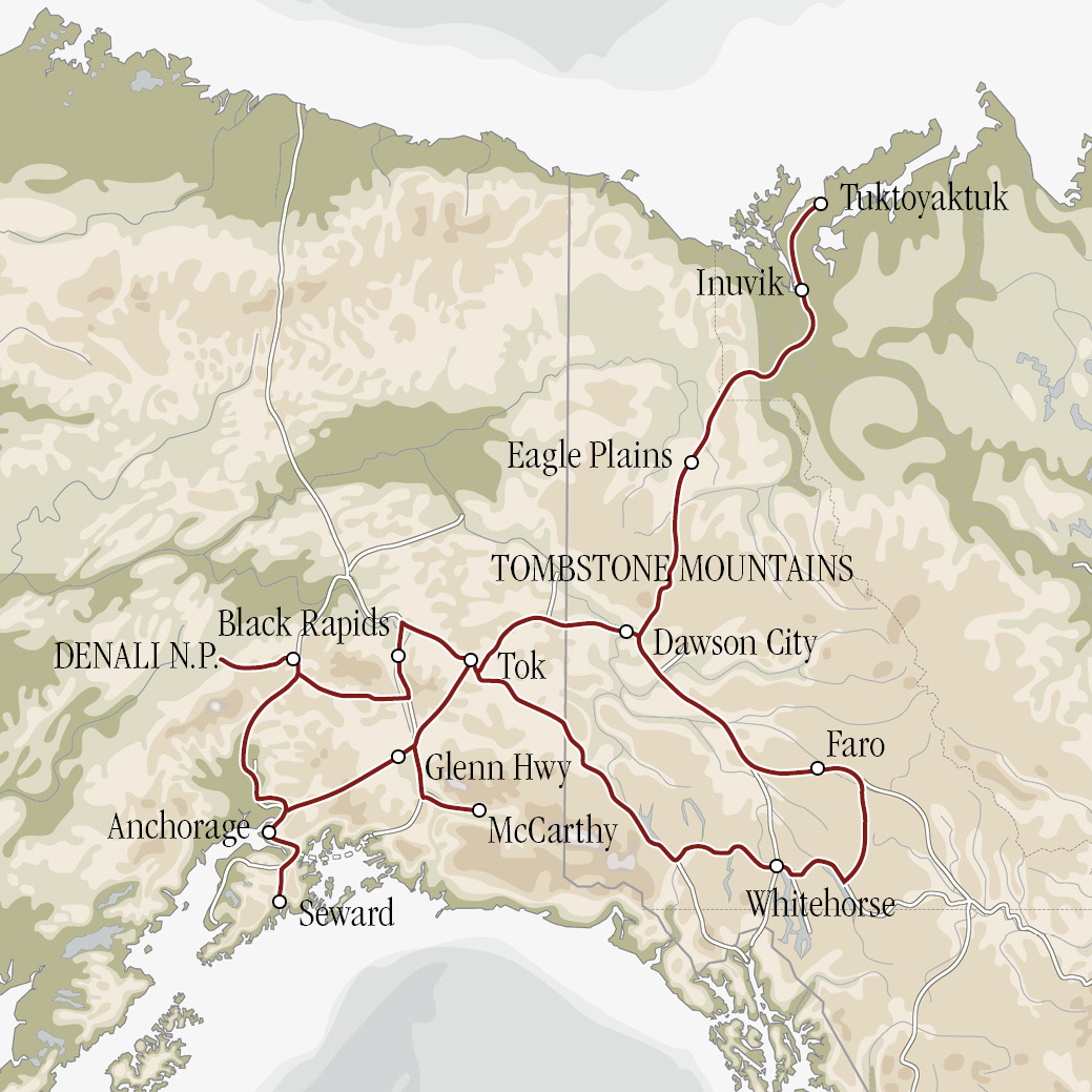 Auf dem Programm stehen der Hatcher Pass, der Denali Highway, der Top of the World Highway, der Dempster Highway bis weit über den Polarkreis hinaus, der Campbell Highway, die South Canol Road sowie die McCarthy Road. All diese Strecken sind unbefestigt, weshalb ein 4x4 Fahrzeug mit Fahrberechtigung für diese Strassen erforderlich ist.