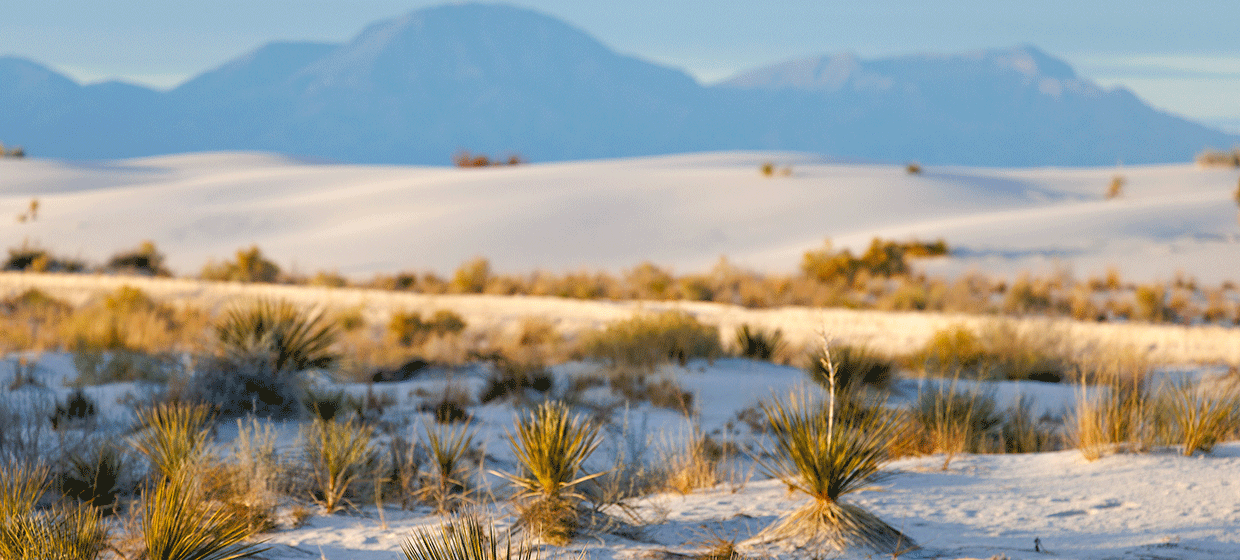 Zwischen den sanft gewellten Dünen gedeihen überraschend robuste Pflanzen wie die hochwachsende Soaptree-Yucca oder tief verwurzelte Wüstensträucher, die sich perfekt an die kargen Bedingungen angepasst haben. Auch die Tierwelt zeigt besondere Überlebensstrategien: Viele der hier lebenden Echsen, Insekten und Kleinsäuger sind hell gefärbt und nahezu unsichtbar im weissen Sand. Der Park ist damit nicht nur ein landschaftliches Highlight, sondern auch ein faszinierendes Beispiel für Naturanpassung in einer extremen Umgebung.